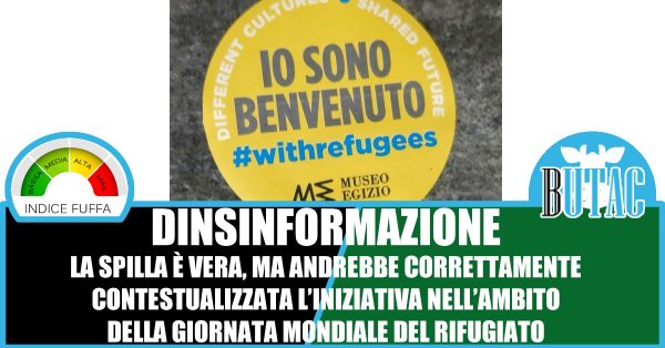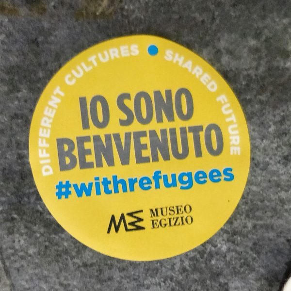 Ma vediamo cosa è questa spilla. Il Museo egizio da alcuni anni festeggia la Giornata Mondiale del Rifugiato (che si celebra il 20 giugno) con un’iniziativa che si chiama Io sono il benvenuto. Dal 2000 su decisione delle Nazioni Unite si è deciso di onorare in quella data tutti i rifugiati di tutti i Paesi del mondo. Non è quindi una novità e non è un’iniziativa del Museo egizio, ma qualcosa di globale che esiste da quasi 20 anni. Il Museo egizio non ha fatto altro che creare una propria occasione per onorare i rifugiati, in date vicine a quella ufficiale al museo possono entrare gratuitamente i rifugiati di ogni nazionalità. L’iniziativa si chiama appunto Io sono il benvenuto.