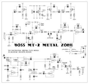 In realtà, infatti, come spiegato anche da Giornalettismo, si tratta del circuito di un famosissimo distorsore a pedale per chitarra elettrica di marca Boss, modello MT-2 Metal Zone. Questo lo schema elettrico originale: