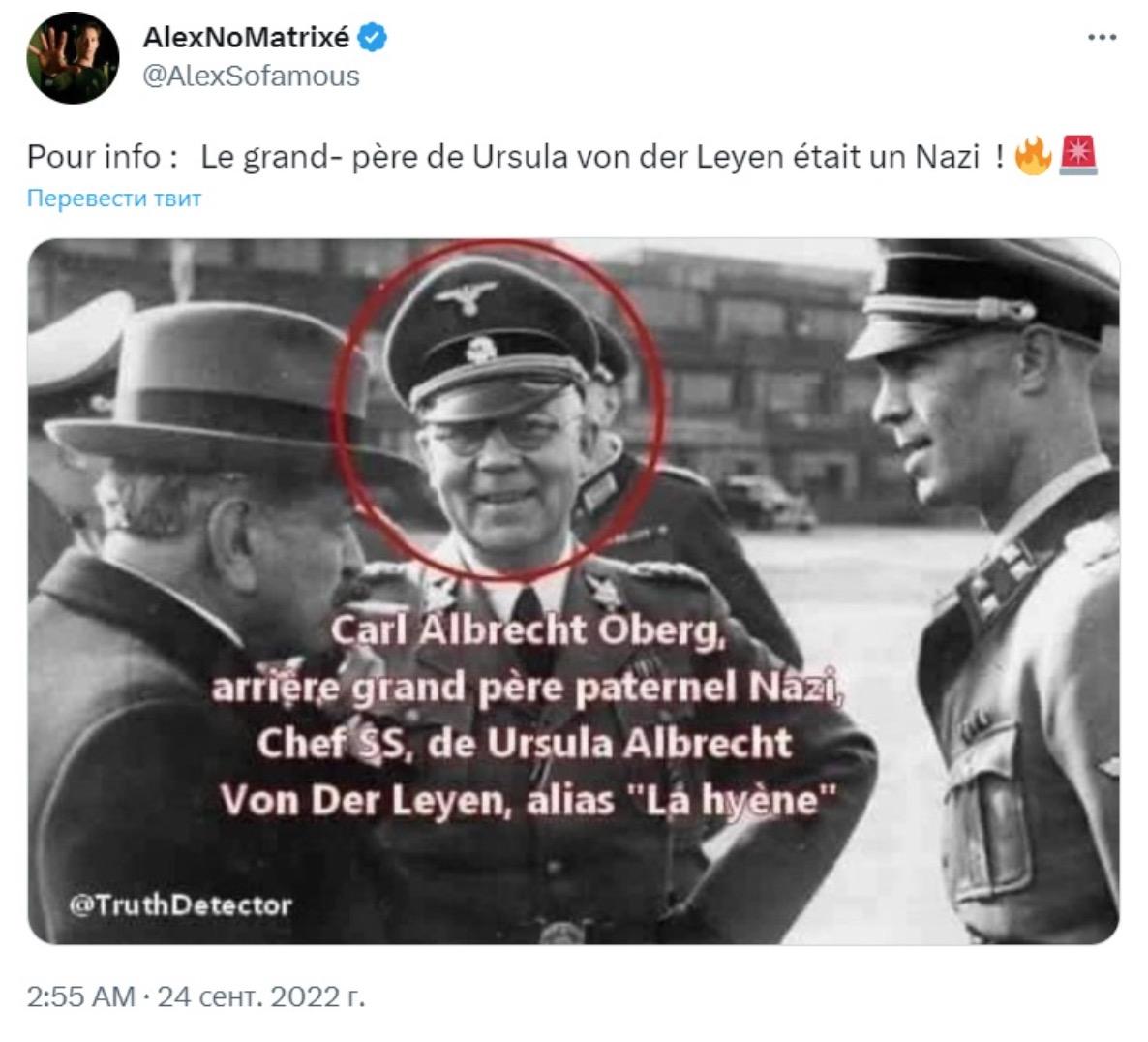 Meme in cui si sostiene che il nonno di Ursula Von Der Leyen fosse Carl Albrecht Oberg, un funzionario delle SS tedesche durante l’era nazista. Ma è una bufala, in realtà il nonno di Von Der Leyen era Carl Eduard Albrecht, che non è stato un ufficiale nazista, bensì uno psicoterapeuta tedesco.
