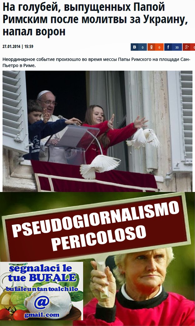 La notizia non è bufala al 100%, l’avrete visto tutti, una delle due colombe lanciate dai bimbi che accompagnavano il Papa è stata attaccata da un corvo e poi uccisa e divorata da un gabbiano…ma il Papa non aveva concluso parlando dell’Ucraina, ma di Cocò il bimbo bruciato vivo nell’auto di cui credo tutti avete sentito parlare.