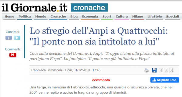 Non c’è uno sfregio, l’ANPI ha difeso la memoria di un partigiano, senza porre veti sul dedicare qualcosa a Quattrocchi, basta che non sia un luogo che finora era dedicato a un altro di cui è importante conservare memoria. La famiglia ha spinto perché si andasse in questa direzione, proprio per evitare polemiche e strumentalizzazioni. Ma a Il Giornale evidentemente la cosa non va bene.