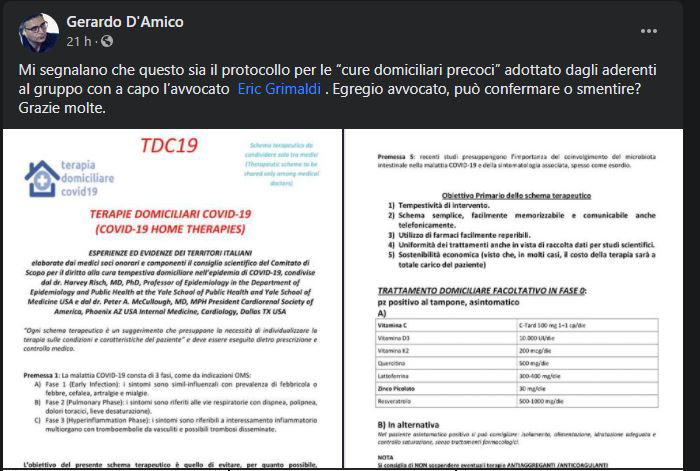 “Migliaia di pazienti sono stati curati a casa con questo protocollo! Con questo protocollo si previene il peggioramento della patologia!”