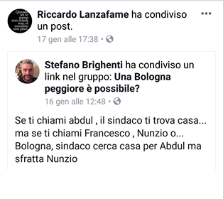 Una verifica mi porta sulla bacheca del ristoratore che ha accusato i suoi compaesani di essere razzisti. È uno di quelli che condividono decisamente molto materiale. Un po’ dei post sono da pagine con visualizzazione ristretta per cui non riesco a visualizzarli, altri sono post che sono stati rimossi all’origine, ma uno mi suona strano sulla bacheca di un anti razzista: