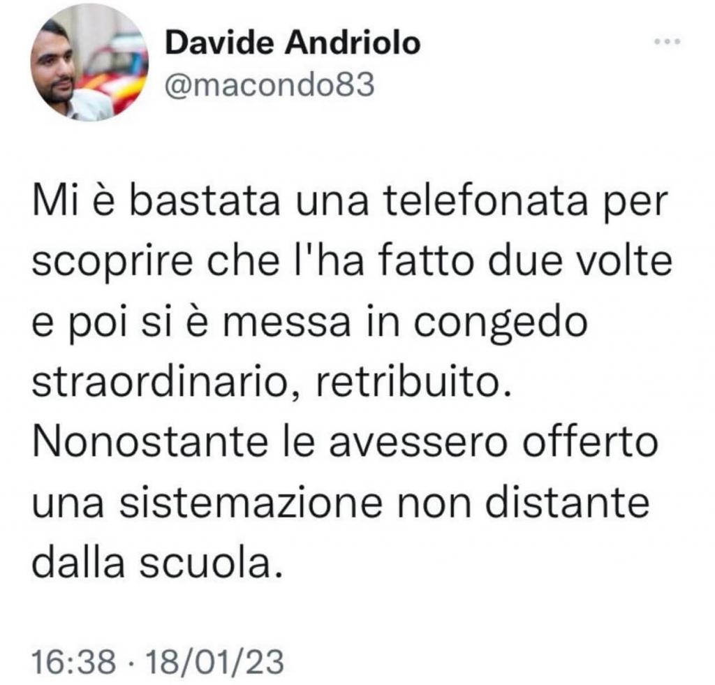 Avevamo visito il tweet di Davide Andriolo che spiegava già ieri alle 16:38 di aver parlato con amici che operano nella struttura in cui Giuseppina Giuliano lavora, nel tweet Andriolo spiegava che gli era stato comunicato che la donna avrebbe lavorato due giorni per poi essersi messa in congedo retribuito. Andriolo ha avuto quest’informazione da canali personali, canali che a noi non possono, ovviamente, confermare o smentire, ma riteniamo che non abbia senso che Andriolo si sia inventato il fatto, visto che l’avesse fatto la condanna per diffamazione sarebbe certa.