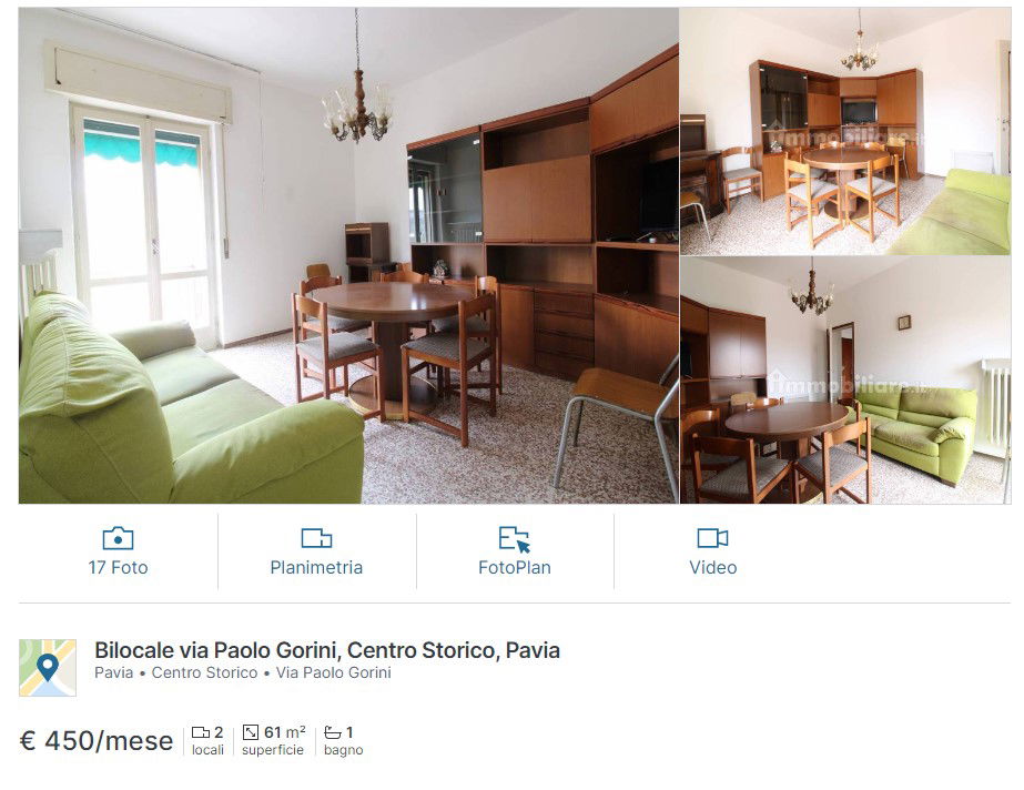 Giuseppina parla anche di punti accumulati, che sappiamo possono dare diritto a svariati servizi tra cui i biglietti premio, purtroppo andrebbe fatta una verifica direttamente con lei per poter capire se davvero riesca a spendere solo 400 euro di treno al mese ma anche coi punti premio l’impresa di spendere solo 400 euro al mese risulta impossibile. Sia chiaro, gli articoli probabilmente volevano essere l’equivalente di una denuncia sociale, Milano è troppo cara per chi non ha stipendi importanti. Denuncia condivisibile, ma andrebbe verificato meglio tutto il racconto di Giuseppina. Anche perché, come abbiamo potuto verificare in pochi secondi, a breve distanza da Milano con i mezzi pubblici si trovano appartamenti a cifre molto inferiori. Ad esempio a Pavia (57 minuti di treno e metro dal liceo in cui lavora) si trovano appartamenti a cifre decisamente inferiori che a Milano, come questo bilocale a 450 euro al mese.