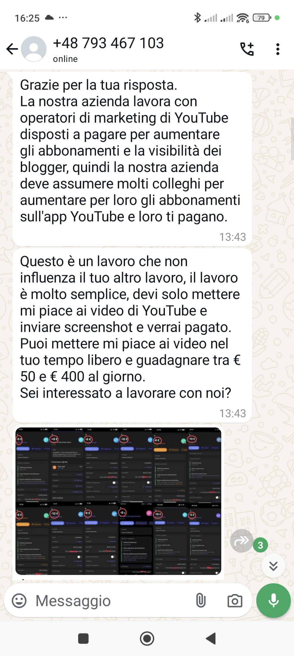 Mentre per i facili lavoretti venivamo contattati direttamente via WhatsApp, in questo caso prima si riceve questa chiamata in cui una suadente voce ci comunica che il nostro curriculum “è stato approvato” e che vogliono che siamo noi a ricontattarli. Così facendo riescono a scremare moli di numeri di telefono impressionanti, concentrandosi, sempre tramite automatismi, solo su quelli che avranno risposto al messaggio registrato.