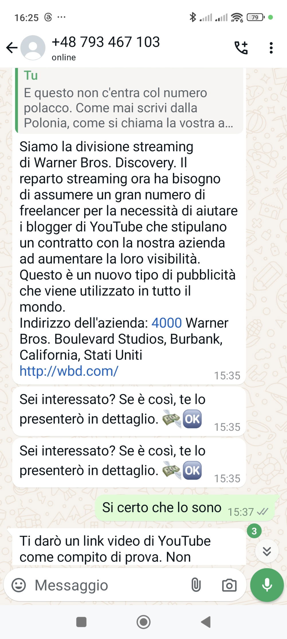 Stavolta, dopo mille segnalazioni, la chiamata è arrivata a me e ho potuto superare la prima fase, arrivando a contattare il numero via WhatsApp per vedere dove volevano andare a parare, solo per scoprire che il modus operandi è lo stesso identico di quegli altri messaggi sui facili lavoretti da svolgere a casa. Solo l’incipit cambia.