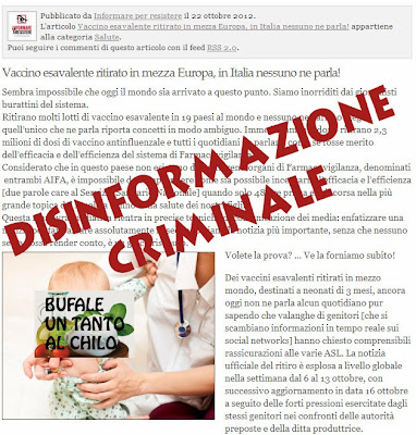 Nell’appello si parla anche di una seconda segnalazione, che nulla ha a che vedere con il vaccino esavalente. Si parla del vaccino antinfluenzale Inflexal V, sempre del 2012. Questi sarebbe stato ritirato dagli ambulatori italiani a causa di sospetti inquinamenti. Innanzitutto NON è ritirato dopo che era stato commercializzato: semmai è stato distribuito in ritardo. Il blocco è dovuto alla presenza di microbatteri nello stabilimento di produzione di due lotti. Per sicurezza, sono stati richiamati quelli già in distribuzione. La cosa si è risolto – come nel caso GSK – e il vaccino è stato NORMALMENTE rimesso in commercio. Qui un articolo del Corriere che ne parlava.