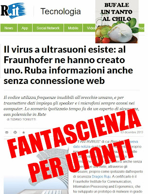 Per il giornalista della Repubblica l’argomento è importante, poco più di un mese fa aveva dato la stessa notizia partendo dalle informazioni di Dragos Ruiu famoso hacker che ha sollevato un polverone #badBIOS dalla fine di Ottobre, Dragos sosteneva di aver scoperto un “Virus” che aveva infettato le sue macchine senza che fosse stato fatto nulla…il virus secondo Dragos è partito via audio da una chiavetta USB che ha infettato un computer che è arrivato nelle vicinanze dei suoi e da li si è propagato, senza accesso alla rete, senza scambio di dati…via etere…o meglio via ultrasuoni.