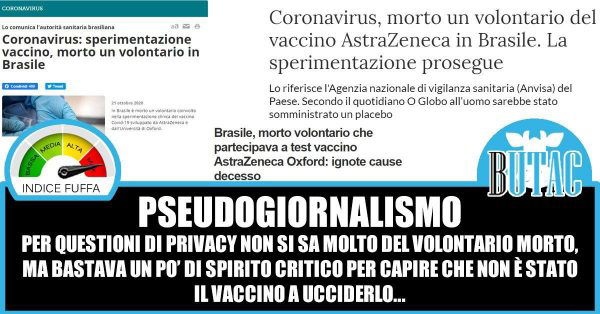 Fosse morto a seguito dell’inoculazione del vaccino su cui si sta appunto sperimentando, i test sarebbero stati bloccati. Perlomeno per capire se il vaccino avesse avuto una qualche parte nel suo decesso. Il fatto che tutti i comunicati stampa inviati dal Ministero della Salute brasiliano spieghino che la sperimentazione continua significa che il volontario non aveva ricevuto una dose di vaccino. Può essere che fosse nel gruppo che ha ricevuto un placebo o in quelli che hanno ricevuto un vaccino già noto e in commercio per la meningite. La necessità di privacy fa sì che il governo brasiliano non possa dire di più. Ma il protocollo prevede che se un soggetto volontario muore durante una sperimentazione la stessa si fermi. Se questo non è avvenuto significa che il volontario non è mai entrato in contatto con il vaccino sotto sperimentazione. Basta un pizzico di spirito critico per rendersene conto. I titoli usati da alcune testate italiane fanno solo l’effetto dello spaventare e la paura è un perfetto concime per le fake news!