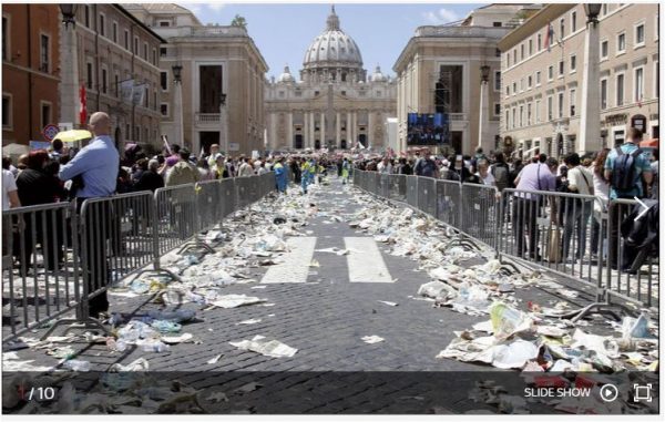 Qualsiasi piazza, purtroppo, dopo il passaggio di una moltitudine di persone si riduce male, siamo maleducati, specie quando siamo in mezzo alla folla dove è facile che nessuno noti la cartaccia che stiamo buttando in terra. Dovremmo imparare a essere più educati, dovremmo studiare meglio l’educazione civica.