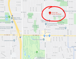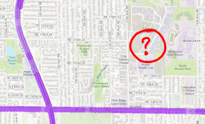 Lo studio della pediatra evidenziato da un punto interrogativo e in viola la copertura antenne del 5g a Seattle nella sua area.