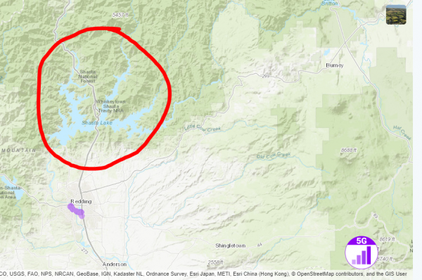 Mount Shasta non ha al momento 5G attivo, solo la zona di Redding, a sud, ha un’area di copertura, ma decisamente limitata: