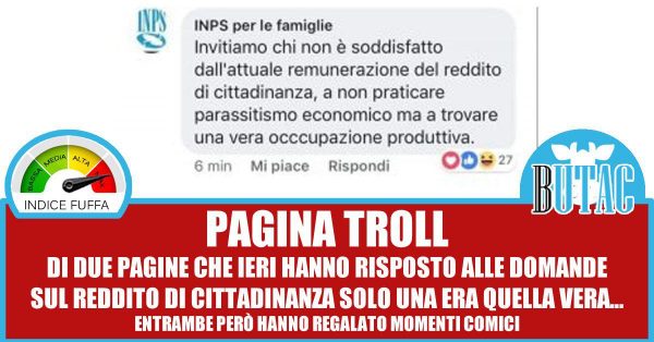 Entrambe le pagine ieri hanno risposto alle domande dei cittadini sul Reddito di Cittadinanza. I social media manager hanno avuto un bel po’ da fare, ma mentre quelli della pagina ufficiale, pur sotto un altissimo livello di stress, sono riusciti nella maggior parte dei casi a portare a casa la pagnotta*… Quelli della pagina fake erano chiaramente lì per prendere per i fondelli chi ci cascava.