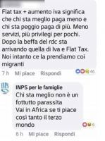 Utente: Flat Tax + aumento IVA significa che chi sta meglio paga di più. Meno servizi, più privilegi, per pochi. Dopo la beffa del rdc sta arrivando quella di Iva e Flat Tax. Noi intanto ce la prendiamo coi migranti. INPS per le famiglie: Chi sta meglio non è un fottuto parassita. Vai in Africa se ti piace così tanto il terzo mondo.