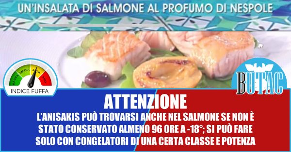 Mi avete segnalato una trasmissione di RaiUno, Buongiorno Benessere, o meglio la puntata del 25 maggio 2019. Nel segmento dedicato alla cucina ci viene presentata una ricetta per un’insalata di salmone al profumo di nespole.