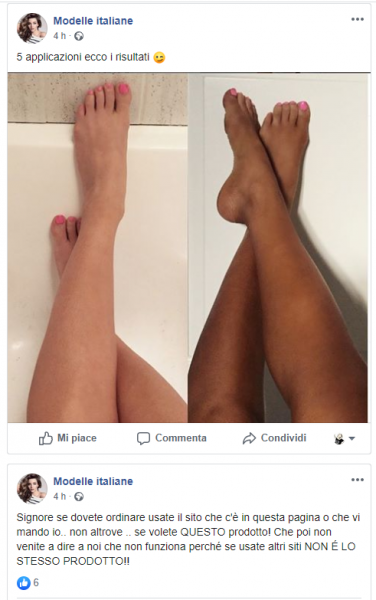 Una lettrice mi ha segnalato una tentativo di vendita online che ho trovato interessante da raccontarvi. La pagina Facebook Modelle Italiane, creata il 22 novembre 2019, offre un prodotto per l’abbronzatura istantanea.