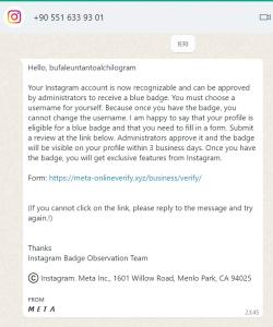 Ovviamente siamo di fronte all’ennesima truffa, in questo caso però ci sono alcuni pericoli. Chi ci ha inviato quel messaggio infatti ha collegato il numero di cellulare con cui ci siamo registrati al nostro profilo Instagram, e quindi sfruttando link come quello che ci avevano inviato (e che ora pare disabilitato) potevano riuscire a impossessarsi del nostro account. BUTAC non è un grande influencer su Instagram, ma ha comunque un profilo da quasi 15mila follower, quindi può fare gola a qualche truffatore. Il messaggio WhatsApp è studiato per colpire tutti coloro che sono evidentemente attratti dalle possibilità della rete, basta poco per fare crollare ogni difesa.
