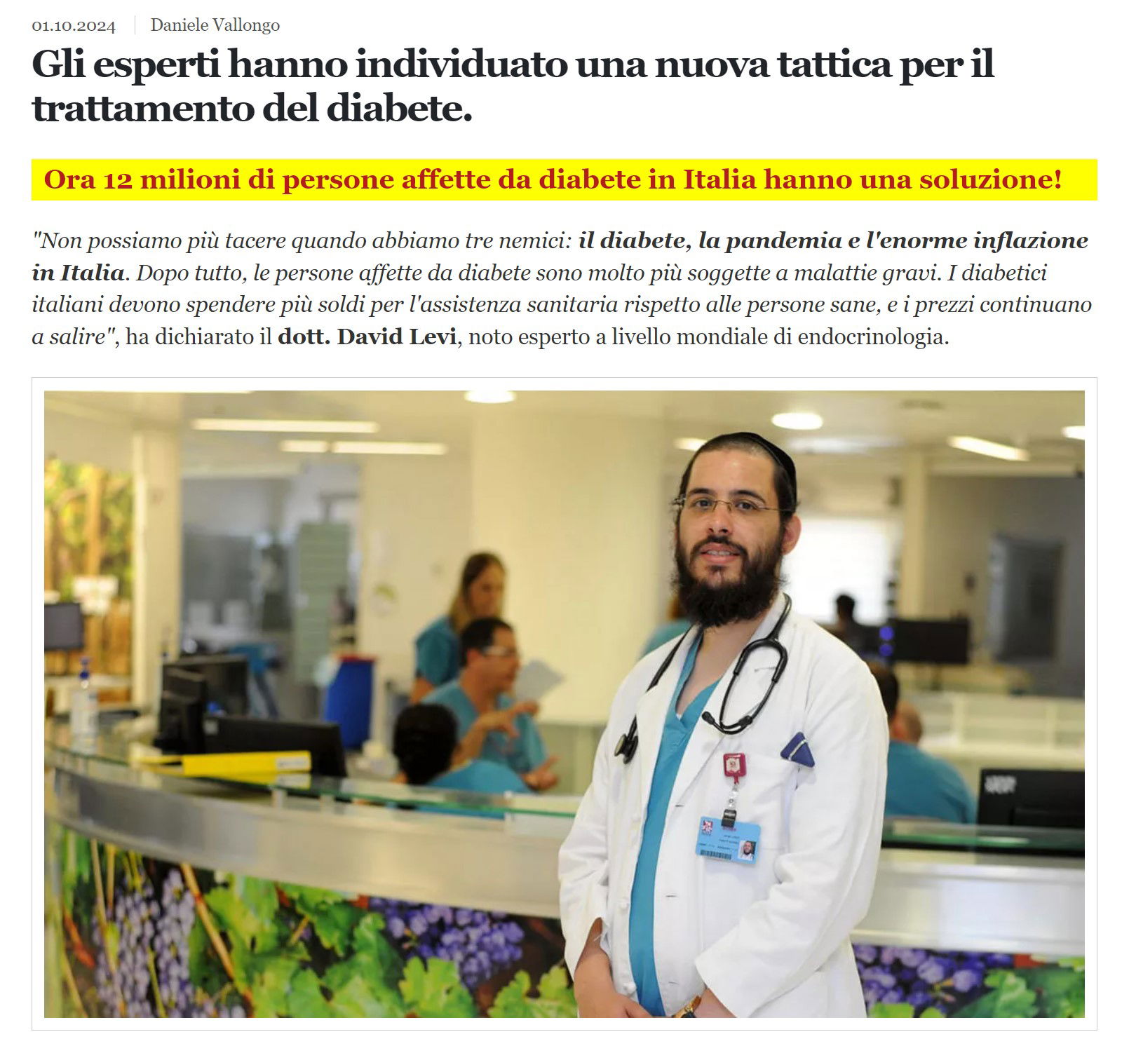 Del prodotto in questione ci eravamo già occupati a settembre 2023; all’epoca veniva sfruttata l’immagine di Bocelli ospite da Fazio quando ancora era in casa Rai. Oggi si danno un’aria più professionale usando un medico, curiosamente israeliano – Davide Levy, o almeno questo è il nome che gli danno i nostri cari venditori di olio di serpente. In realtà il signore nella foto è sì un medico, ma si chiama Yehuda Sabiner (come ci ha segnalato il nostro lettore, che ci ha inviato i link sia alla pagina truffaldina che alla fonte dell’immagine).