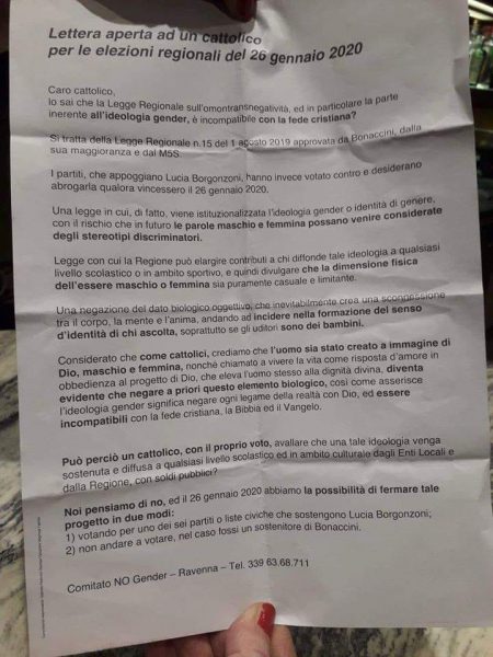 2) non andare a votare, nel caso fossi un sostenitore di Bonaccini.Comitato NO Gender Ravenna – Tel. 339 63.68.711