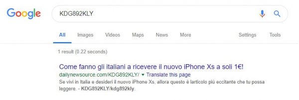 Il trucchetto è facile, un messaggio virale lanciato sulle app di messaggistica sfugge ai controlli e alle verifiche dei social e incuriosisce. Inserendo quel codice su Google troviamo un singolo risultato (il codice è studiato ad hoc per risultare così):