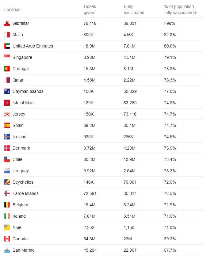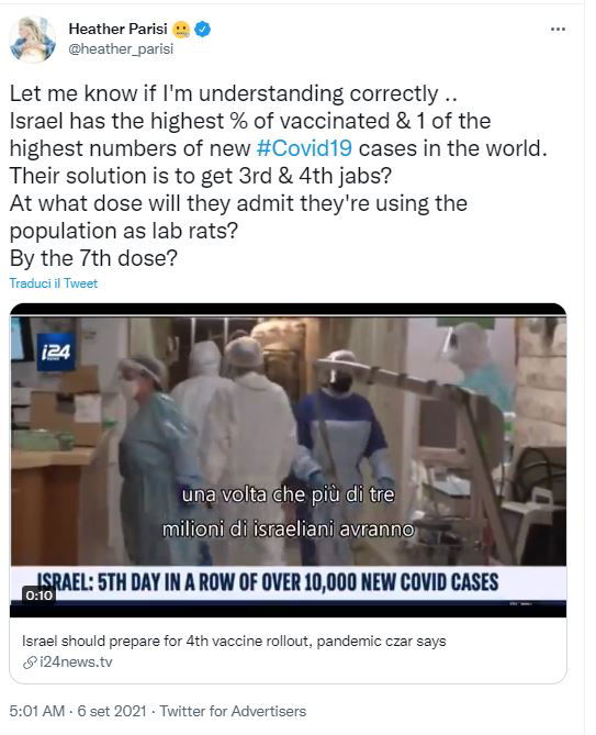 Ma anche l’altra frase di Heather non è che fosse proprio corretta, infatti lei sostiene che Israele abbia la più alta percentuale di vaccinati al mondo. Ma non è vero: persino l’Italia, in percentuale li ha superati da tempo. La loro copertura era la più alta a marzo, quando la campagna vaccinale era partita velocissima, raggiungendo in maniera capillare e molto efficiente la fascia più a rischio. Ma oggi Israele sulla popolazione totale ha una copertura del 61.2% di individui completamente vaccinati. L’Italia ha un 63,8%, e un 72,3% di parzialmente vaccinati. Ma anche noi siamo lontani dai numeri di Paesi come quelli che vedete nella classifica di Our World in Data: