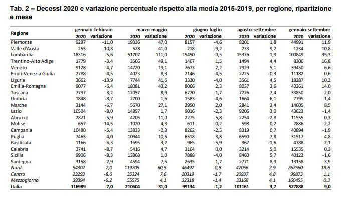 la colonna che c’interessa è quella finale, che fa il confronto con le medie dei decessi a Nord, Centro e Mezzogiorno tra il 2015 e il 2020. Al Nord abbiamo un incremento generale del 18,6%, al Centro dell’1,1, al Mezzogiorno sale dello 0,3%.
