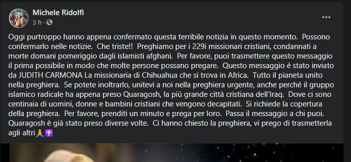 Oggi purtroppo hanno appena confermato questa terribile notizia in questo momento. Puoi corrobenerlo nelle notizie. Che tristezza! Per favore pregate per i 229 missionari cristiani, che sono stati condannati a morte dagli islamici afghani domani pomeriggio. Per favore, puoi trasmettere questo messaggio il prima possibile in modo che molte persone possano pregare. Questo messaggio è stato inviato da JUDITH CARMONA, un missionario di Chihuahua che si trova in Africa. L’intero pianeta è unito nella preghiera. Se riesci a inviarlo di nuovo, ti preghiamo di unirci alla preghiera urgente, anche perché il gruppo islamico radicale ha appena preso Quaragosh, la più grande città cristiana in Iraq. Dove ci sono centinaia Cristiani, donne e bambini che vengono decapitati. Sta chiedendo la copertura della preghiera. Per favore, prendi un minuto e prega per loro. Passa il messaggio a chiunque tu possa.Abbiamo chiesto la preghiera, per favore passala agli altri
