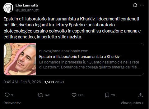Elio lannutti: Epstein e il laboratorio transumanista a Kharkiv. I documenti contenuti nei file, rivelano legami tra Jeffrey Epstein e un laboratorio biotecnologico ucraino coinvolto in esperimenti su clonazione umana e editing genetico, in perfetto stile nazista.