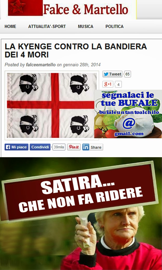 No, la Kyenge non si è espressa contro il simbolo della Sardegna, la mitica bandiera dei 4 mori. Siamodi fronte a una bufalocomicata tratta da un sito come Falce & Martello, sito che oltre ai soliti attacchi ironici al Ministro dell’integrazione tra le altre cose pubblica articoli di un certo pregio e livello: