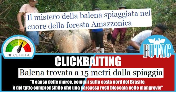 Qui il link all’articolo originale su Lettera43, che però non è molto più lungo di questo: bastano poche righe per spiegare perché il titolone fosse puro e semplice clickbait. Potete però trovare il video dell’associazione che ha trovato la balena e i loro tweet, che hanno specificato da subito che “A causa delle maree, comuni sulla costa nord del Brasile, è del tutto comprensibile che una carcassa resti bloccata nelle mangrovie”.