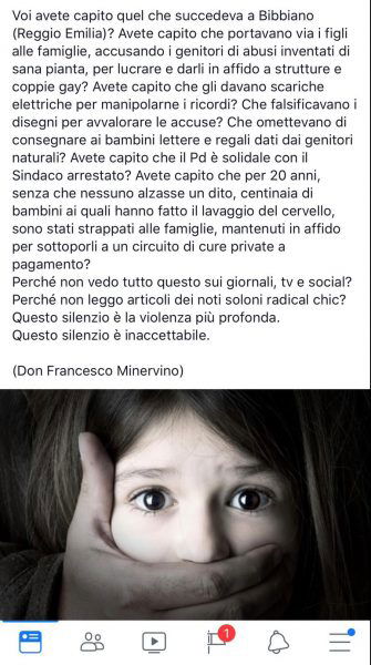 Voi avete capito quel che succedeva a Bibbiano (Reggio Emilia)? Avete capito che portavano via i figli alle famiglie, accusando i genitori di abusi inventati di sana pianta, per lucrare e darli in affido a strutture e coppie gay? Avete capito che gli davano scariche elettriche per manipolarne i ricordi? Che falsificavano i disegni per avvalorare le accuse? Che omettevano di consegnare ai bambini lettere e regali dati dai genitori naturali? Avete capito che il Pd è solidale con il Sindaco arrestato? Avete capito che per 20 anni, senza che nessuno alzasse un dito, centinaia di bambini ai quali hanno fatto il lavaggio del cervello, sono stati strappati alle famiglie, mantenuti in affido e sottoporli a un circuito di cure private a pagamento? Perché non vedo tutto questo sui giornali, tv e social? Perché non leggo articoli dei noti soloni radical chic? Questo silenzio è la violenza più profonda. Questo silenzio è inaccettabile. (Don Francesco Minervino)