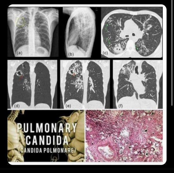 Quadro micotico polmonare dovuto a miceti infettanti del genere Candida albicans, Candida glabrata, Candida Krusei e Candida Lusitaniae.