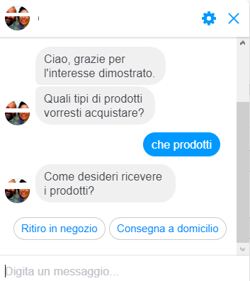 Non metterò il link e neanche foto della pagina per non dare loro visibilità, ma appena ho aperto il link mi è piaciuto molto l’automatismo della chat di Facebook, che subito mi ha chiesto se volessi acquistare i loro prodotti:
