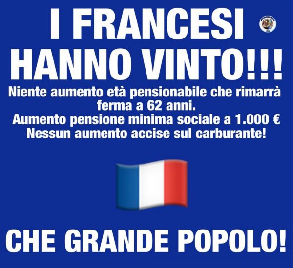 I francesi hanno vinto!!! Niente aumento età pensionabile che rimarrà ferma a 62 anni. Aumento pensione minima sociale a 1.000 E€ Nessun aumento accise sul carburante! Che grande popolo!