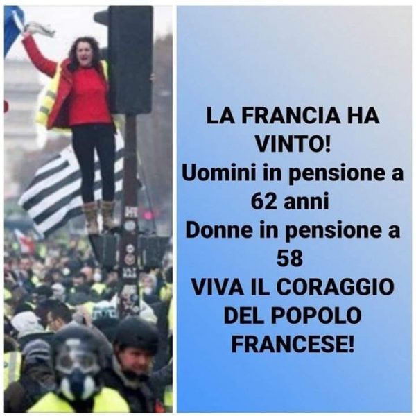 La Francia ha vinto! Uomini in pensione a 62 anni Donne in pensione a 58 Viva il coraggio del popolo francese!