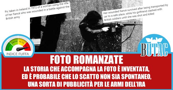 Potremmo definire il racconto molto emozionante, di quelli che ti viene voglia di condividere d’istinto. Peccato che la storia non romanzata sia meno affascinante. La foto viene dall’Irlanda, e mostra una donna che imbraccia un AR18, un fucile d’assalto di produzione americana, chiamato amichevolmente the widowmaker (il crea vedove). La foto è attribuita a Colman Doyle, fotografo irlandese di quegli anni. Il racconto del fidanzato ferito è un’invenzione di questi tempi di acchiappaclick, fino all’avvento dei social la foto circolava su libri con questa didascalia:
