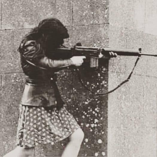 Fotografia scattata in Irlanda nel 1972 di una donna che usa il fucile del suo fidanzato ferito in una battaglia contro l’esercito britannico. Il suo fidanzato ferito è sopravvissuto dopo essere stato trasportato in auto in un luogo sicuro, mentre la sua ragazza si è scontrata con i soldati britannici fino a quando non è stata colpita e uccisa.