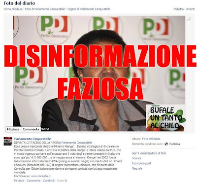 Parliamo del primo ministro di colore italiano e donna, Cecile Kyenge, l’admin della pagina (ed evidentemente admin del “quotidiano” online L’Onesto, o molto amici) in pochissime righe ci racconta di come la Kyenge sia d’accordo con la Lega musulmana mondiale (peccato sia cattolica di padre cattolico, e che tutto il suo percorso studi in Italia l’abbia fatto in Università cattoliche e con l’aiuto del vescovo della propria zona), si racconta dell’associazione DAWA (fondata dal ministro nel 2002) traducendo la cosa come MAGIA e omettendo invece che la parola in swaihili vuol anche dire : MEDICINA o STAR BENE (e guarda caso la Kyenge ha studiato medicina)! Poi ci narra che l’associazione è nata con l’aiuto del suo collega deputato PD Khalid Chaouchi (che nel 2002 aveva 19 anni e era ancora distante da qualsiasi carriera politica, è stato eletto deputato nel 2013)!