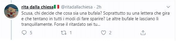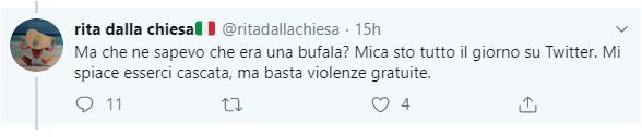 Il profilo Twitter non ha la spunta blu di profilo verificato, ma dal numero dei follower e dal tenore dei commenti direi sia proprio un account collegato a Rita Dalla Chiesa. Oltre 200mila follower. Il tweet da lei fatto riporta un link a Imola Oggi, una testata che da anni è stata inserita nella nostra black list (lista usata da svariati studi per analizzare i siti che diffondono bufale e disinformazione nel nostro Paese). L’articolo che la signora Della Chiesa condivide è noto per essere una bufala. Ma non tutti sono in grado di verificare una fonte, non tutti comprendono la differenza tra una notizia completa di tutti i criteri per cui abbia senso condividerla e una non-notizia creata apposta da bufalari che stanno cercando di parlare alle pance del proprio pubblico. Rita Dalla Chiesa evidentemente rientra nella seconda categoria. Non lo dico per cattiveria, ma a seguito dei tanti che le hanno fatto presente che la notizia non risultava corretta ha risposto così: