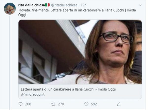 In quasi 24 ore non ha rimosso nulla, lasciando che il link di Imola Oggi facesse le sue “meritate” visualizzazioni. Noi avevamo già spiegato in un articolo come quelle frasi riportate nella lettera fossero diffamazione nei confronti della famiglia Cucchi, diffamazione che evidentemente a Rita Dalla Chiesa non viene da verificare, perché tanto, dirà, lei ha solo riportato un link. Un link che però arriva da uno dei siti di estremismo di destra più noti e agguerriti in Italia. Il testo dell’articolo di Imola Oggi non riporta fonti, ma solo questa riga finale: