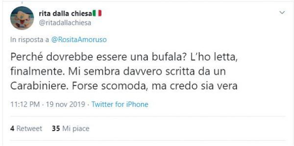 Perché dovrebbe essere una bufala? L’ho letta, finalmente. Mi sembra davvero scritta da un Carabiniere. Forse scomoda, ma credo sia vera
