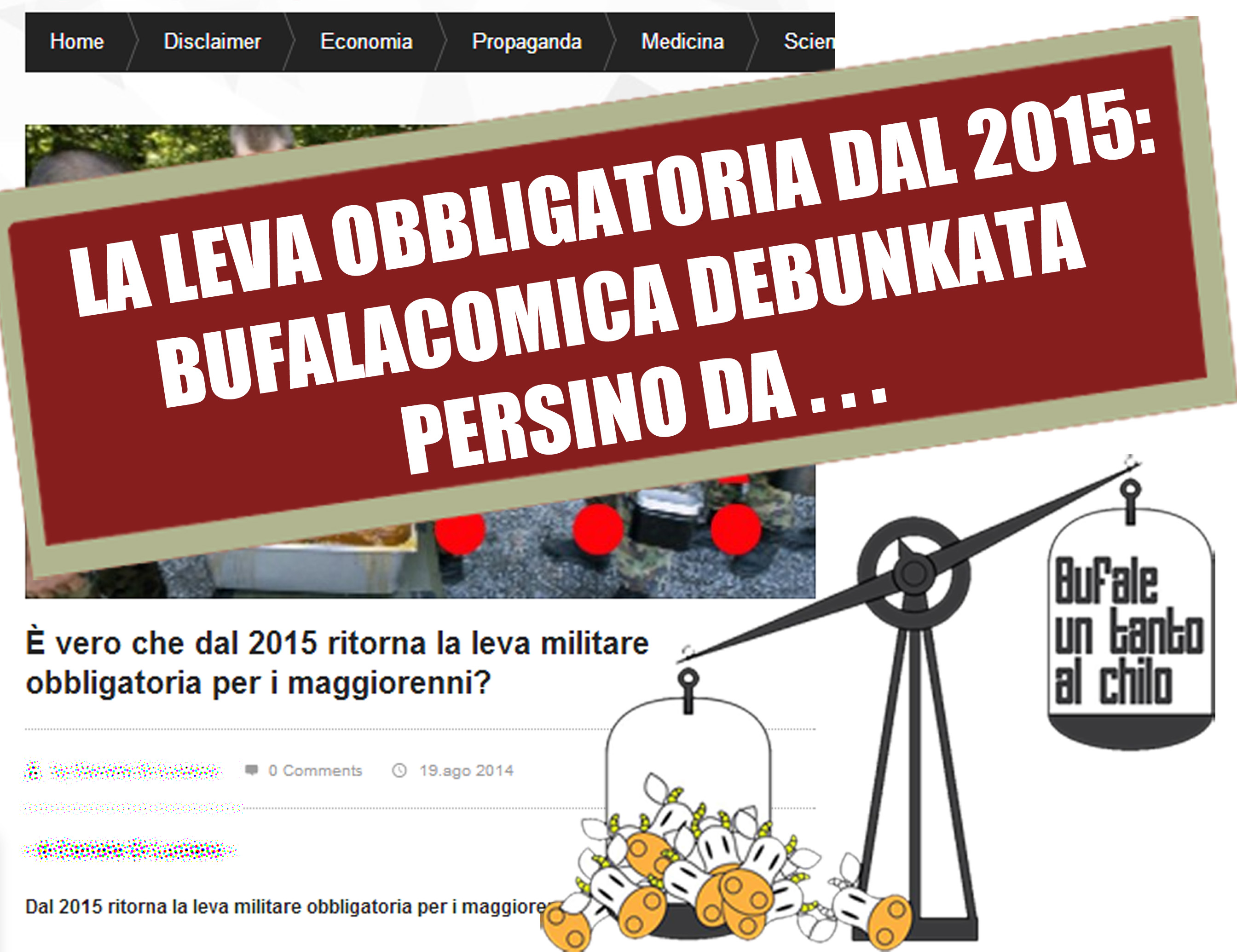 Ritorna la leva obbligatoria. A causa degli eventi recenti in medioriente, compresi i comunicati intimidatori da parte di gruppi integralisti islamici come l’isis nei confronti dei paesi comunitari quali l’Italia, considerato lo scarso numero di esponenti a servizio permanente nelle forze armate, complice la poca preparazione atletica e tattica, secondo alcune indiscrezioni provenienti da funzionari del Ministero, il governo ha deciso di ricostituire la leva obbligatoria a partire dall’anno 2015. Tutti coloro che abbiano compiuto 18 anni o che ebbero diritto all’esonero per un periodo retrattivo di massimo dieci anni, per motivi non inerenti a gravi deficienze di salute (termine degli studi, servizio civile, obiettore di coscienza) dovranno presentarsi entro un termine massimo di 90 giorni presso lo sportello unico della difesa (presente in tutte le OSL del territorio) per ritirare documentazione relativa alla domanda di reintegrazione nelle forze armate. I trasgressori verranno prelevati con spiegamento di forze se necessario dal proprio domicilio affinché vengano indirizzati obbligatoriamente al conseguimento del certificato di addestramento bellico secondo il protocollo Badoglio 45c per la difesa patriottica federale.