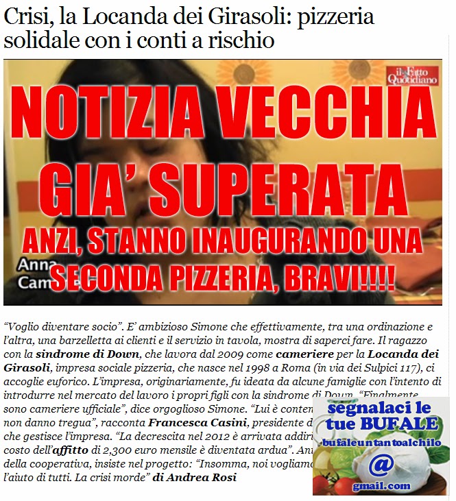 Una follower su Facebook mi ha segnalato (grazie Sara) che sta circolando una notizia che coinvolge una pizzeria romana un po’ speciale: La locanda dei girasoli, la notizia (vecchia comunque di Novembre 2012) è che La locanda rischia la chiusura, e probabilmente è anche stato un rischio reale, visto che nel Febbraio 2013 Il Fatto Quotidiano pubblicava quest’articolo: http://tv.ilfattoquotidiano.it/2013/02/02/roma-locanda-dei-girasoli-pizzeria-solidale-con-conti-in-rosso/219452/ La chiusura veniva dal fatto che lavoravano poco e che quindi (secondo il Fatto) fossero in ritardo coi pagamenti di affitto e forniture.