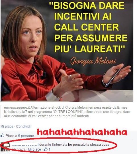 Giorgia Meloni ma cosa dici? Dopo certe affermazioni rimango allibito. E voi cosa ne pensate??? Laureati nei Call Center? Bhà…