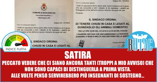 Ah sì scusate, dimenticavo di spiegare quanto è già noto a chiunque abbia un filo di razionalità rimasta in testa. Il Comune di Bugliano NON ESISTE, si tratta di una pagina satirica che da tempo prende in giro chi ci casca. Basta scrollare la pagina un secondo per rendersene conto, o cercare il nome del Sindaco in rete… Ma è evidente che il livello che stiamo raggiungendo tocca vette sempre più alte. Non mi sorprenderebbe sapere che con le ultime rilevazioni l’OCSE ci abbia rimesso all’ultimo posto nella classifica mondiale sugli analfabeti funzionali.