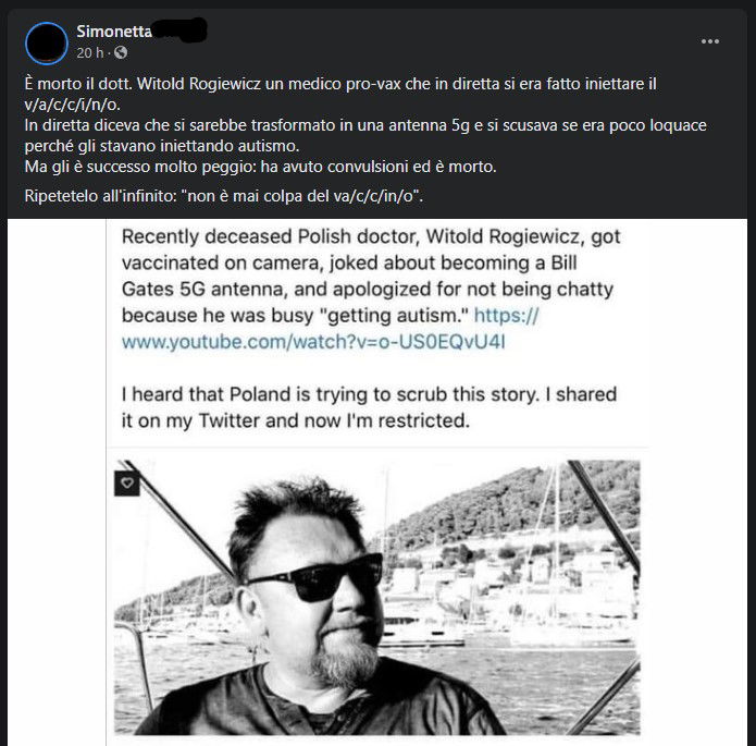 È morto il dott. Witold Rogiewicz un medico pro-vax che in diretta si era fatto iniettare il v/a/c/c/i/n/o. In diretta diceva che si sarebbe trasformato in una antenna 5g e si scusava se era poco loquace perché gli stavano iniettando autismo. Ma gli è successo molto peggio: ha avuto convulsioni ed è morto. Ripetetelo all’infinito: “non è mai colpa del va/c/c/in/o”.