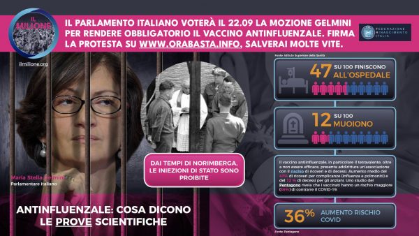 Il giorno 22.09.2020 verrà messa a votazione la mozione Gelmini sull’obbligatorietà del vaccino antinfluenzale.Gli scriventi cittadini italiani intendono con questa mail informarLa circa la loro assoluta contrarietà. L’evidenza scientifica, inconfutabile, dimostra la scarsissima utilità ma al contempo l’enorme pericolosità dell’antinfluenzale.