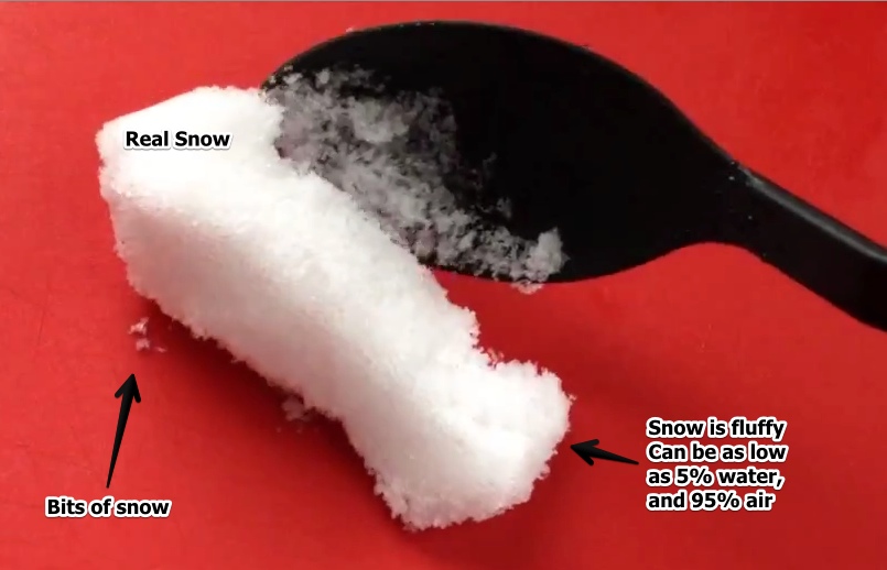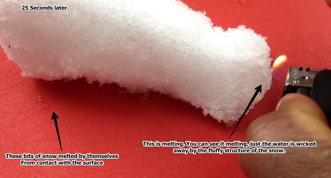 Poi il nostro simpatico complottista usa una piccola fiamma ossidrica, e scalda metà panetto di neve, l’acqua evapora e rimane intrappolata nella neve sottostante, ma il nostro eroe non lascia che la fiamma sciolga il tutto rivelando che rimarrebbe acqua …ma si blocca, e procede al successivo esperimento, cioè paragonare il ghiaccio e la sua reazione al panetto di neve… ma si sa, il ghiaccio è acqua al 100% quindi è ovvio sciolga in maniera totalmente diversa.