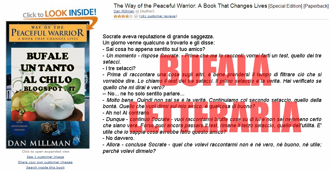 Comincio così, per pura curiosità, a interrogare le fonti probabili o anche solo possibili e così di fronte al deserto sui miei mezzi provo pure una ricerca libera su google. Anche qui apparentemente niente: centinaia di occorrenze ma neppure una volta la fonte è indicata. Finché, che cosa scopro? Che si tratta di un lacerto di un libraccio di Dan Millman (“La via del guerriero di pace. Un libro che vi cambierà la vita”) in cui uno dei protagonisti ha per pseudonimo nientedimeno che Socrate (il buon gusto nel titolo e nei nomi dei personaggi gli hanno garantito vendite, pare, nell’ordine delle centinaia di migliaia di copie in giro per il mondo).